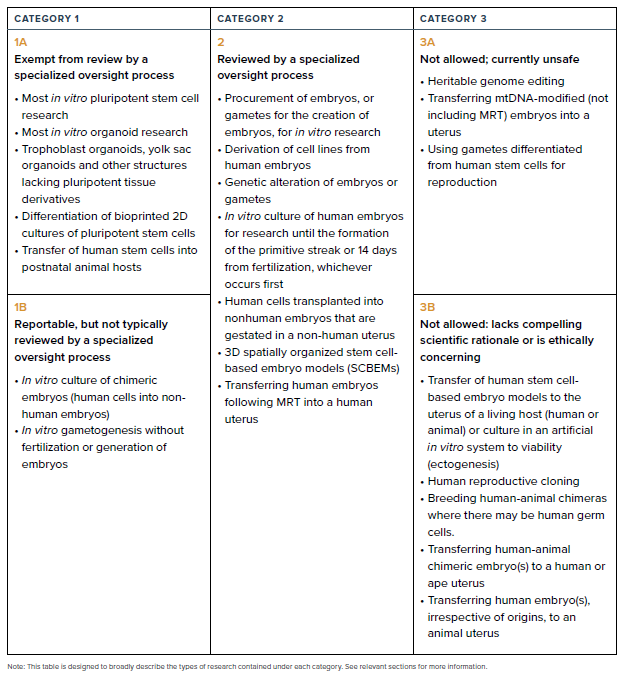 Recommendation 2.2: To ensure that human embryo and related stem cell research is proceeding with due consideration, to ensure consistency of research practices among scientists globally, and to specify the types of scientific projects that should be subject to review, the research review and oversight process should use the three categories described in this section.